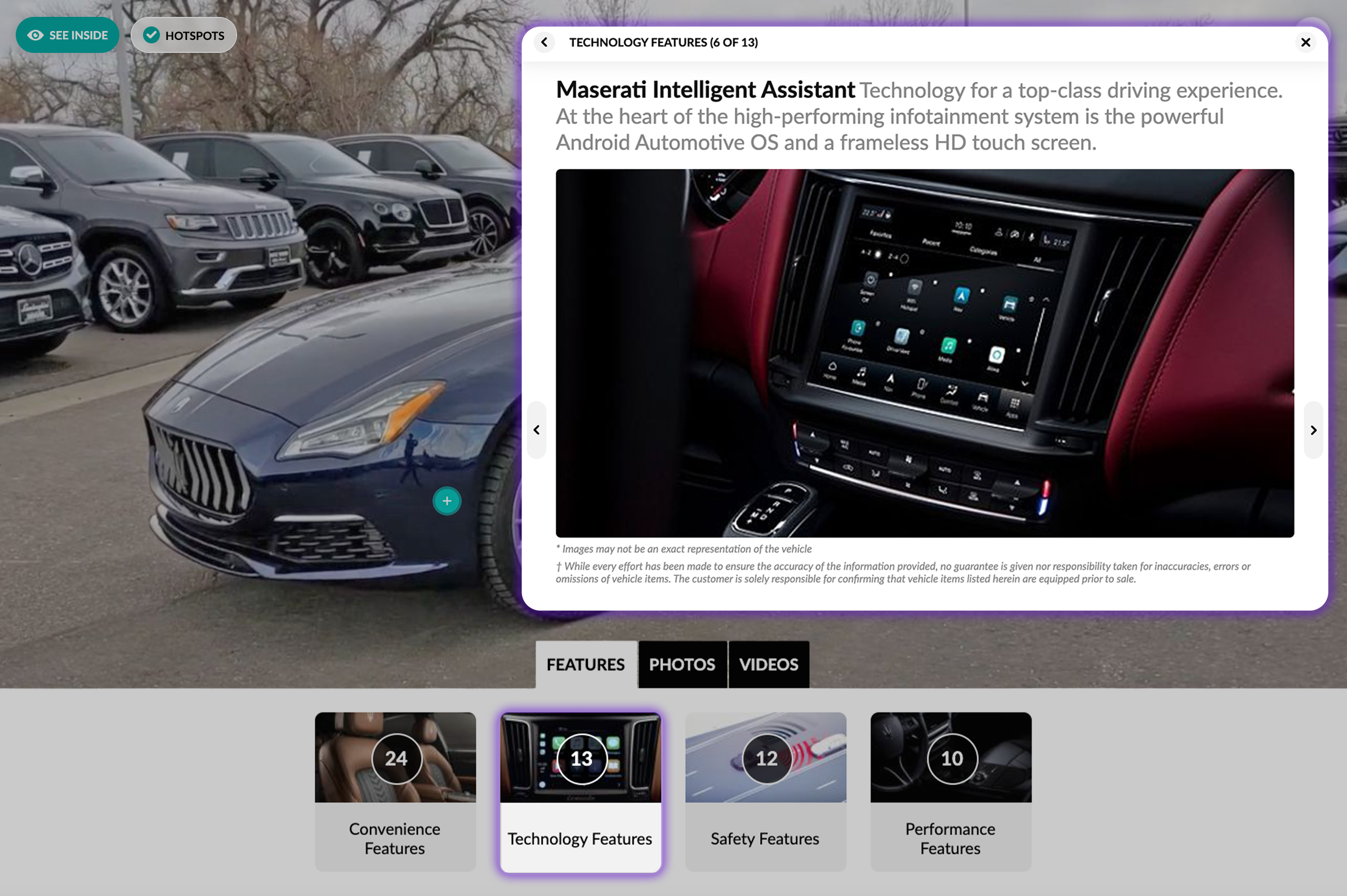 Today’s technically advanced vehicles are filled with features that are difficult to explain. And long lists and descriptions do little to help shoppers feel more informed. Feature Tour addresses this challenge by bringing carefully crafted videos, images and explainer content to your VDPs, showcasing vehicle features in easy-to-understand ways based on each shopper’s specific preferences. By educating consumers with rich, OEM-endorsed multimedia content, retailers can differentiate their inventory and increase margins. And because we track what features each user looks at, your sales team has the insights they need to provide truly personalized follow-ups.